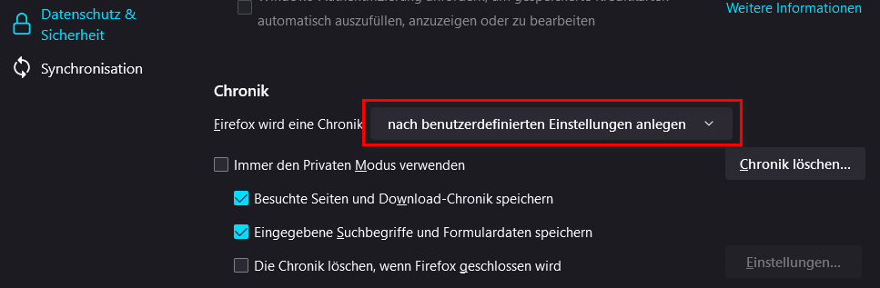 Chronik erstellen, siehe Bild. Steht dort "niemals anlegen", ist das wie der private Modus (lila Maskensymbol) und dort sind in beiden Fällen ohne Änderungen keine Erweiterungen erlaubt. Ist eigentlich ganz einfach.