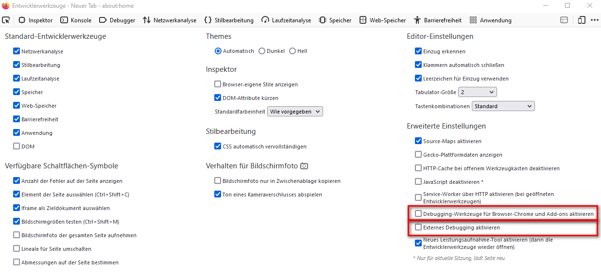 Er muss diesen Punkt und den darunter "Externes Debugging" aktivieren.