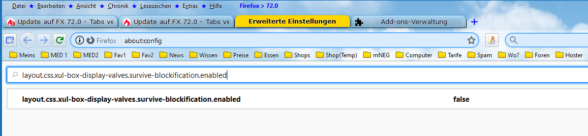 In dem Zusammenhang gleich mal schauen was bei dem Wert layout.css.xul-box-display-values.survive-blockification.enabled steht, sollte auch auf true gestellt werden.