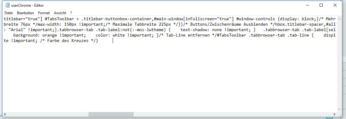 vielen Dank für die beiden userChrome.css-Versionen. Ich habe jetzt auch mal beide Versionen getestet, aber das gefällt mir leider noch nicht... der große Abstand zwischen Tabs und der Eingabeleiste unten drunter ist verschwunden, aber nach oben hin zur Menüleiste ist er immer noch vorhanden. Die Tabs sind in der Höhe immer noch zu hoch und das "Tab-Schließen"-Kreuz innerhalb der Tabs ist immer noch zu klein, bzw. bei der zweiten Version gar nicht mehr da.