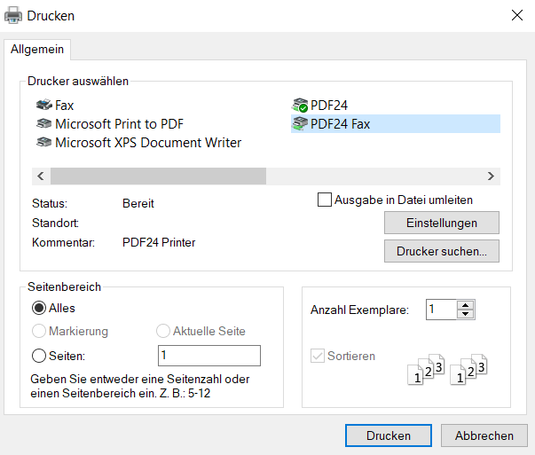 Mir ist heute aufgefallen, dass Microsoft Print to PDF seitens des Firefox gar nicht mehr angeboten wird, wenn ich anstatt des Papierausdrucks eine PDF-Datei erstellen und diese speichern möchte. Beim Edge Chromium wird Microsoft Print to PDF noch im Auswahlmenü angeboten, im Firefox nur noch das installierte Programm PDF24.