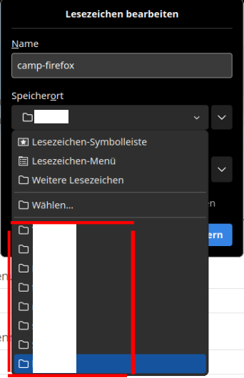 Setze ich einen Favoriten, erscheint ja das Fenster zur Auswahl des Speicherorts. Im roten Quadrat finden sich die zuletzt verwendeten Orte. Will man einen anderen Ort geht es zu "Wählen".
