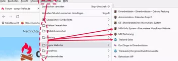 Wenn ich also oben "Lesezeichen" anklicke, öffnet sich die Leiste, in der meine Ordner angezeigt werden, diese wiederum enthalten die in diese Ordner verschobenen Lesezeichen für die Internetseiten. Bei dem Screen also vom Ordner "Eigene Webseiten" zu den Webseiten.