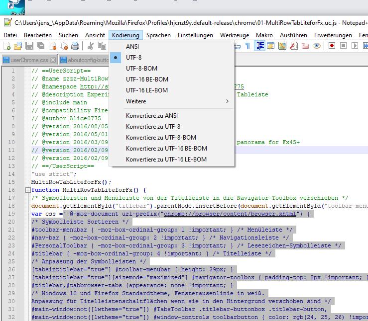 Eintrag der About:Config mit aufzeigen dass es OHNE BOM ist. So ist es bei der 01-MultiRowTabLiteforFx.uc.js auch