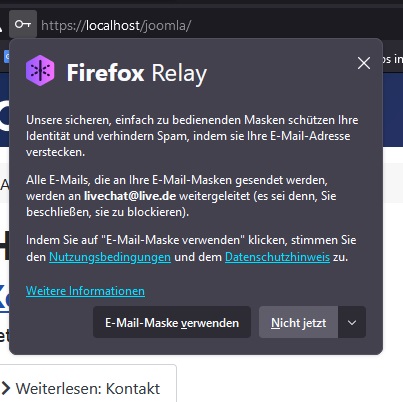 heute ist mir aufgefallen, dass wenn ich über ich meine Joomla Seite lokal aufrufe wird mir das Passwort nicht angezeigt. Es geht ein Popup Fenster auf mit Firefox Relay. Auch wenn ich auf nichts jetzt klicke wird mir das Passwort nicht angezeigt.
