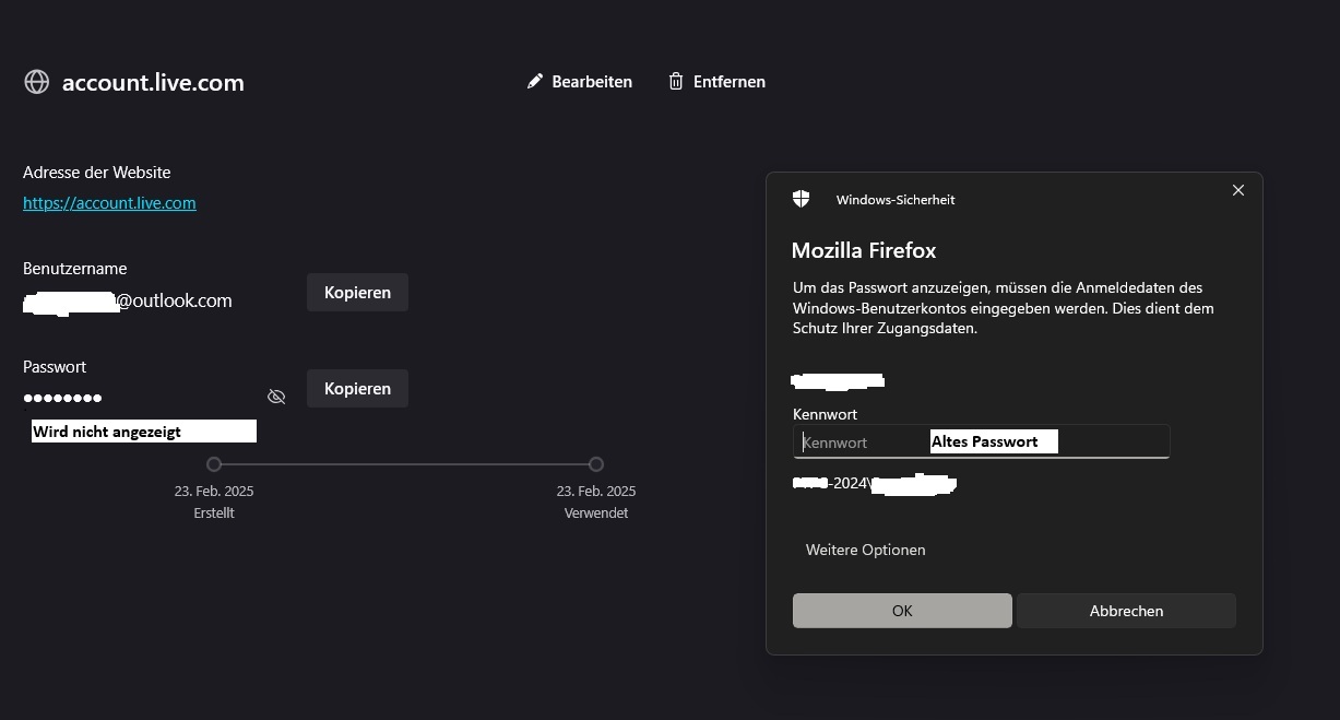 ich habe mein Outlook Passwort ändern müssen. Dieses Passwort wurde mit den dazugehörigen Benutzernamen wurde in Firefox gespeichert. Wenn ich nun im Browserfenster meinen Account suche um die Änderung zu kontrollieren, wird mir das Passwort beim klick aufs Auge nicht mehr angezeigt.