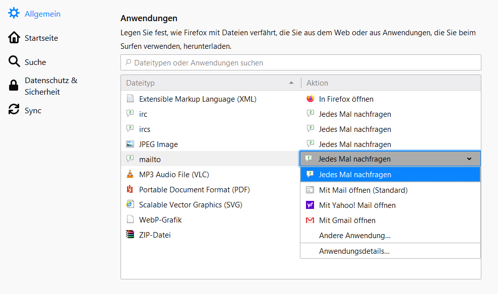 Da in der FF-Einstellung bei mailto "Jedes mal nachfragen" ausgewählt ist, ein Auswahlfenster mit Yahoo, Gmail und Mail (von Windows). Ich kann zwar auch "Andere Anwendung auswählen" klicken, aber das klappt nicht, wenn ich den GMX-Link da reinkopiere.