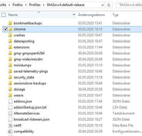 Habe meinen Profilordner gesucht, einen Ordner "chrome" erstellt, die .css erstellt und da rein gepackt...