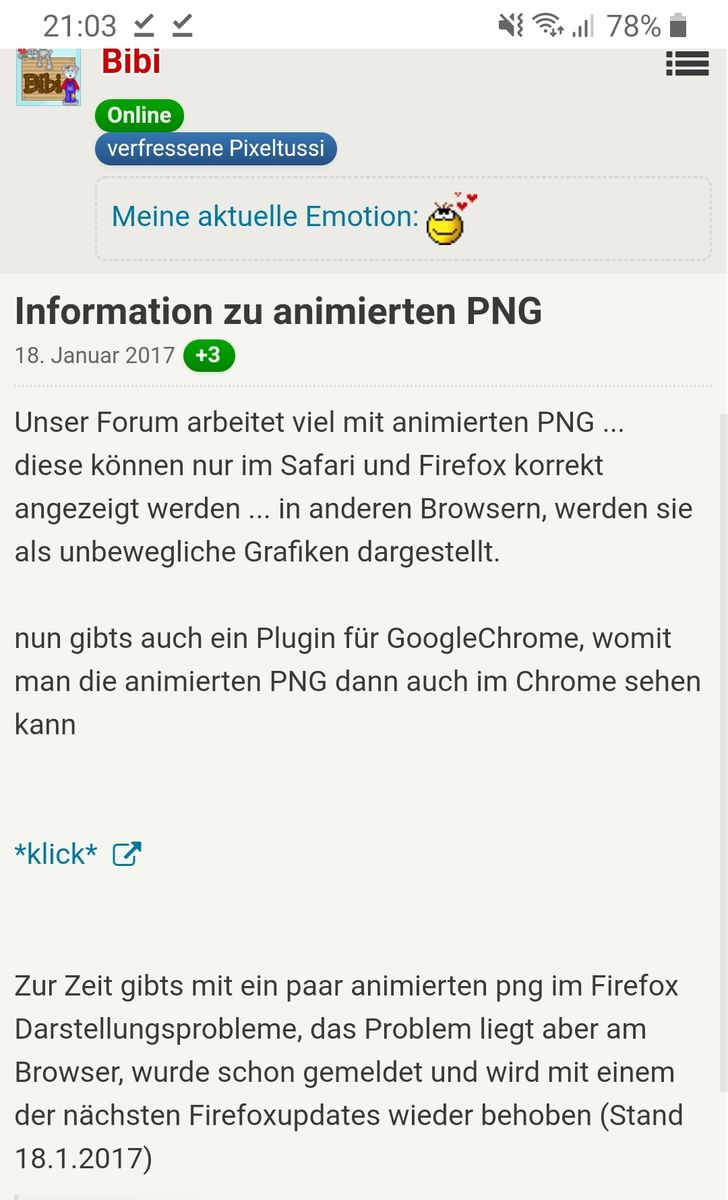 hab jetzt schon über 2 Jahre kein animiertes png mehr erstellt...aber hat meiner Meinung nach bisher im FF ganz gut funktioniert ,dass es abgespielt wurde..soweit ich weiß machte da eher chrome mucken und benötigte ein addon ![]()