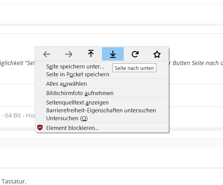 JavaScript Alles anzeigen//ScrollTopAndBottom.uc.js (function() { let menuitem = document.createXULElement('menuitem'); menuitem.id = 'context-to-top'; menuitem.classList.add('menuitem-iconic'); menuitem.setAttribute('tooltiptext' , ''); menuitem.style.listStyleImage='url("chrome://browser/skin/downloads/downloads.svg")'; menuitem.setAttribute('oncommand' , "ownerGlobal.gBrowser.selectedBrowser.messageManager.loadFrameScript(' data: , content.scrollTo(0,0) ' , false);"); let refItem = document.getElementById('context-reload'); refItem.parentNode.insertBefore(menuitem, refItem); })(); (function() { let menuitem = document.createXULElement('menuitem'); menuitem.id = 'context-to-bottom'; menuitem.classList.add('menuitem-iconic'); menuitem.setAttribute('tooltiptext' , ''); menuitem.style.listStyleImage='url("chrome://browser/skin/downloads/downloads.svg")'; menuitem.setAttribute('oncommand' , "ownerGlobal.gBrowser.selectedBrowser.messageManager.loadFrameScript(' data: , content.scrollTo(0,100000) ' , false);"); let refItem = document.getElementById('context-reload'); refItem.parentNode.insertBefore(menuitem, refItem); var css = '\ #context-to-top { \ list-style-image: url("chrome://browser/skin/downloads/downloads.svg");\ transform:rotate(180deg)!important;\ margin-left: 0px !important;\ margin-right: 15px !important;\ }\ }'; var cssUri = Services.io.newURI('data:text/css,' + encodeURIComponent(css), null, null); var SSS = Cc['@mozilla.org/content/style-sheet-service;1'].getService(Ci.nsIStyleSheetService); SSS.loadAndRegisterSheet(cssUri, SSS.AGENT_SHEET); })();