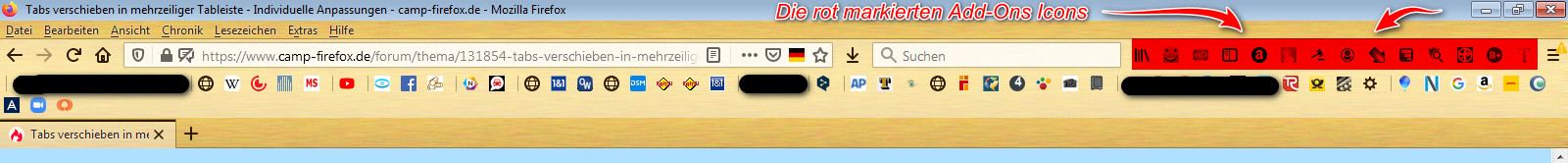 Hallo, meine Adressleiste und die Google -Suchleiste nehmen einfach zu viel Platz ein. Rechts am Rande ist nur wenig Platz für die Icons der Add-Ons. (siehe Foto). Wenn ich die Adressleiste verkleinere, vergrößert sich automatisch die Google-Suchleiste. Das will ich auf keinen Fall. Leider funktioniert bei mir das Überhangmenü nicht, also habe ich im jetzigen Zustand (viel zu große Adress- und Suchleisten und wenig Platz für Add-Ons Icons) keinen Zugriff auf die restlichen Add-Ons.