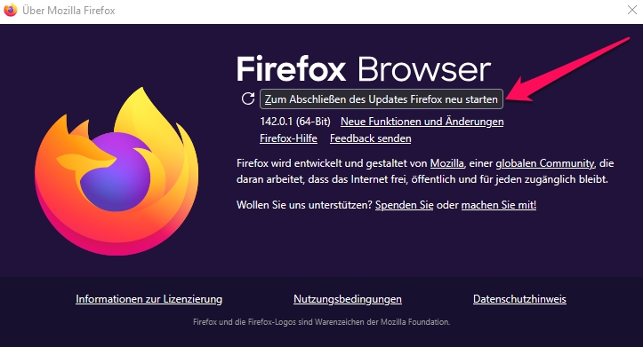 Das Firefox System hängt sich immer am Punkt "Zum Abschließen des Updates Firefox neu starten" auf.