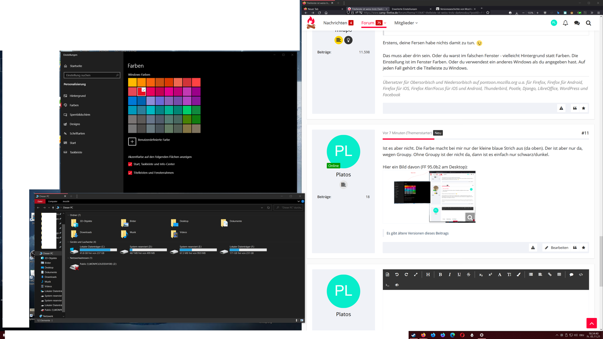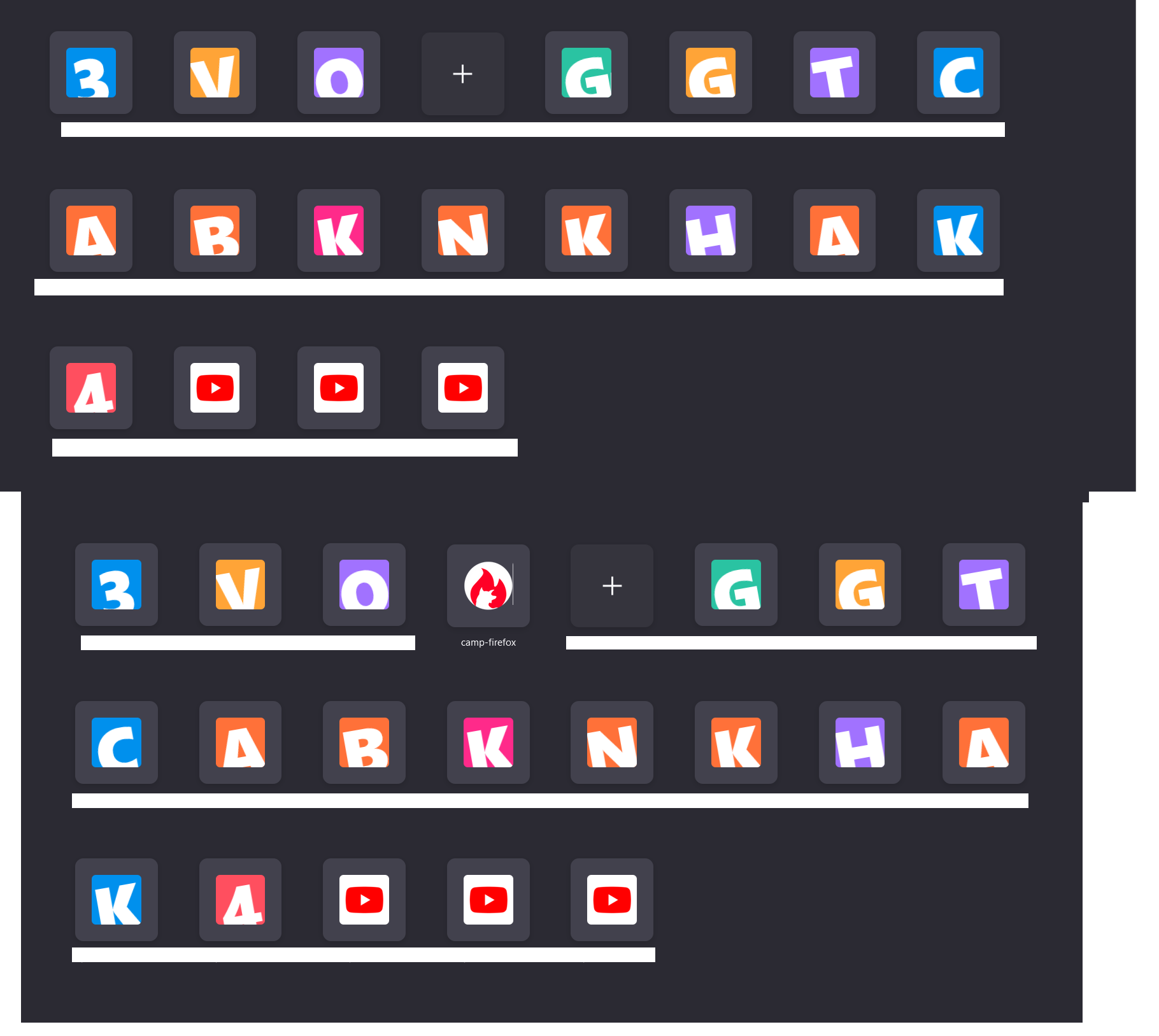 Das obere stellt den Grundzustand dar, wenn ich Firefox öffne. Wenn ich dann anfange Webseiten zu besuchen (hier Camp firefox), schiebt sich das irgendwo dazwischen und verschiebt mir die gaze Ordnung (wobei eigentlich gar keine Ordnung mehr herrscht, da ich nun dank dem fehlen leerer Kacheln gar keine Separierung mehr vornehmen kann und alles einfach auf einem Haufen ist).