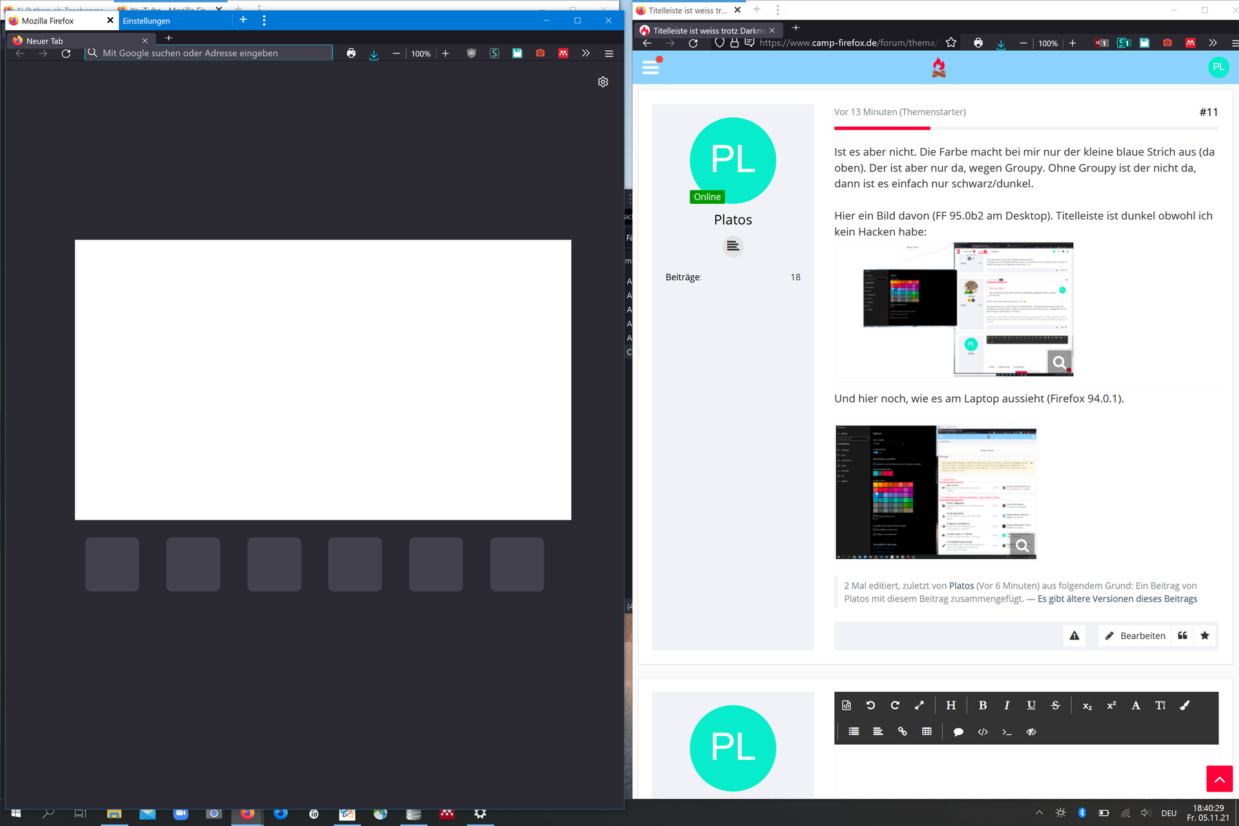 Ich finde einfach nicht heraus, an was das liegt. Ich habe die userChrome.css gelöscht, es liegt nicht an der.