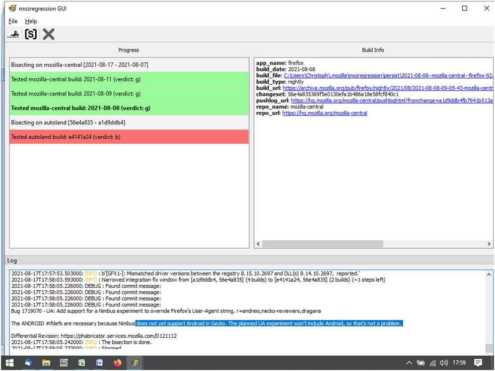 Da ich das Teil nicht so recht verstehe, habe ich es nun nochmals wie im Erklärvideo gemacht. Basic configuration 1. Seite Skip, 2. Seite Skip, 3. Seite Häkchen bei Search for a bug fix. Date = letztes bekanntes Datum, als es noch funktionierte – hier verschiedene Startdatums. Dann habe ich bei einem Datum, welche noch ok war, auf good und bei Zeiten, wo FF nicht mehr funktionierte auf Bad geklickt: