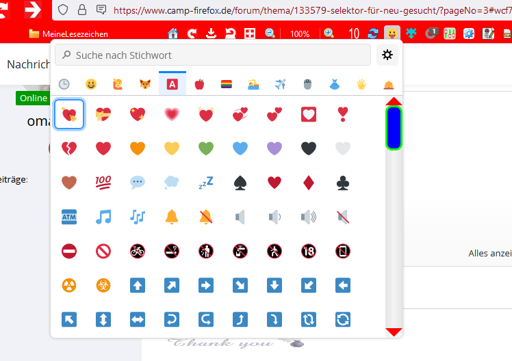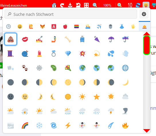 ich brauch eine Erweiterung oder ein Script, das wie dieses Emoji-Erweiterung aussieht, aber man selber eigene Gifs, Emojis, Smileys, Bilder, usw.. einfügen kann. Als Firefox-Erweiterung und wenn man in einer Webseite irgendwas schreibt dann kann man es anklicken und es wird ins Post eingefügt. ![]()