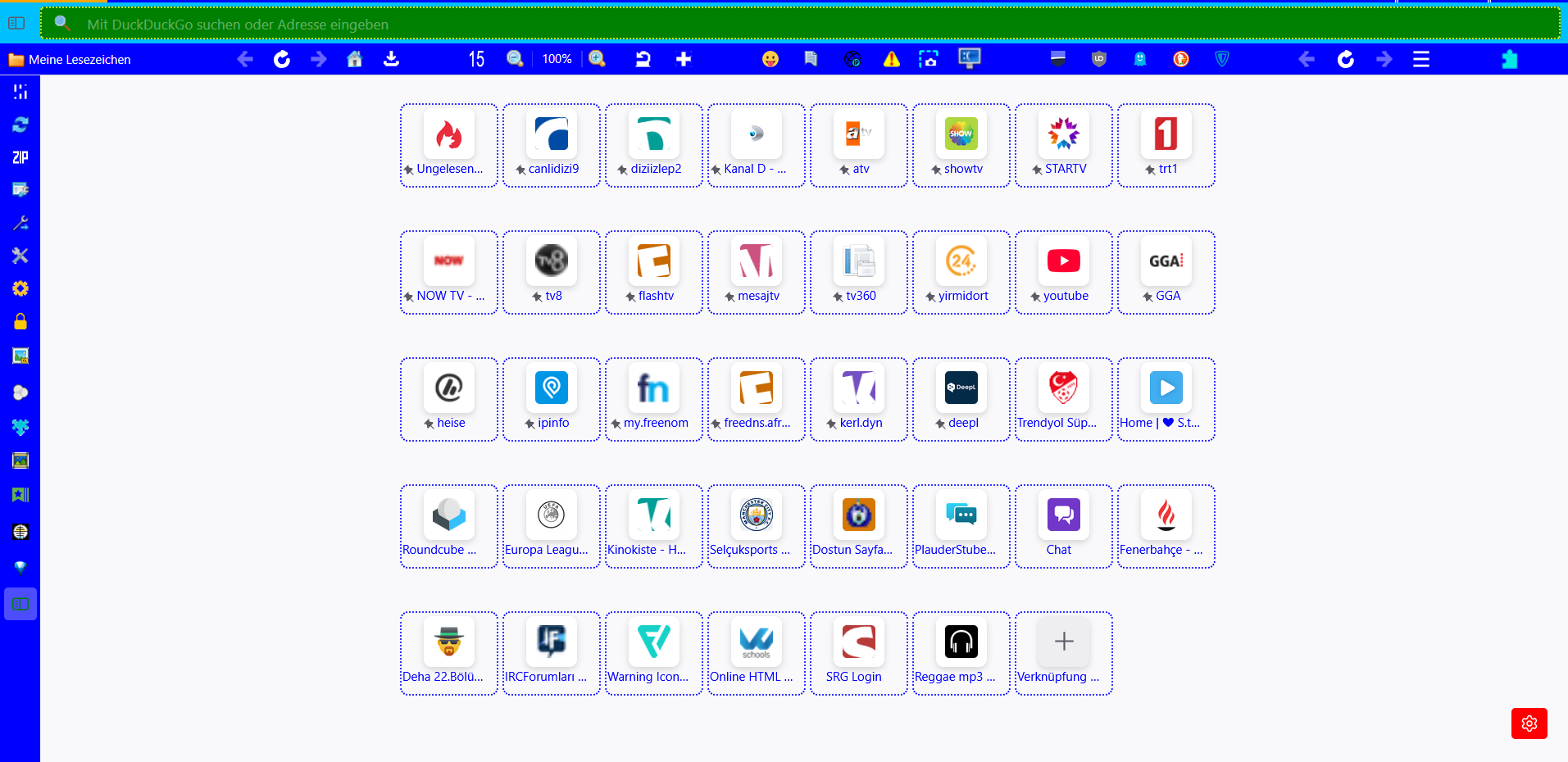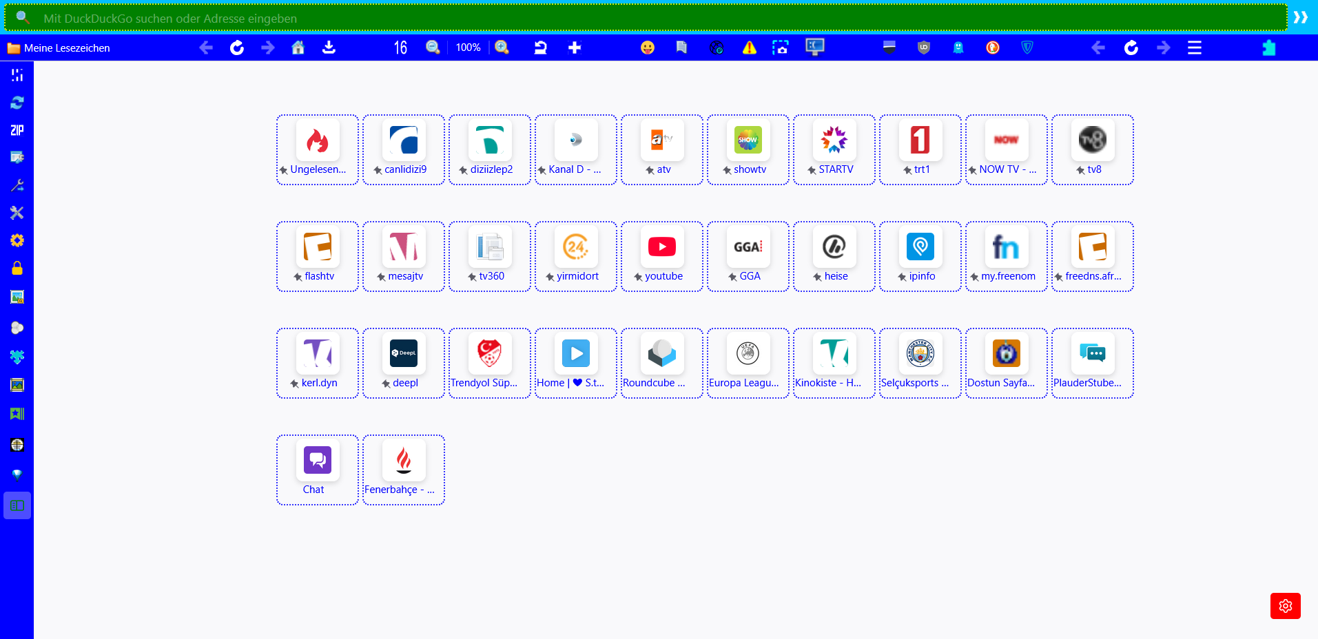 Alles anzeigen@-moz-document url(about:newtab), url(about:home) { body { /*background-image: url('file:///C:/Users/Ramo/AppData/Roaming/Mozilla/Firefox/Profiles/c612nnc8.default-release/chrome/Icons/exc.png') !important;*/ background-repeat: no-repeat !important; background-size: 80px 470px /*1365px 570px*/ !important; background-position: left !important; } .outer-wrapper.ds-outer-wrapper-breakpoint-override { margin-top: -75px; margin-left: 5px; padding-left: 5px !important; padding-right: 5px !important; padding-bottom: 5px !important; /*margin-top: -75px; padding-left: 150px !important; padding-right: 125px !important; padding-bottom: 5px !important;*/ } .search-wrapper .logo-and-wordmark .logo { display: none !important; } .logo-and-wordmark { display: none !important; } .search-wrapper .search-handoff-button, .search-wrapper input { display: none !important; } .search-wrapper { margin-left: -110px !important; } .body-wrapper { margin-top: -30px !important; } .wordmark { visibility: hidden !important; } main { width: 100% !important; } li.top-site-outer { border: 2px dotted blue !important; /* width: 90px !important; height: 50px !important; */ margin-right: 4px !important; } div.tile, div.tile div.screenshot { width: 50px !important; height: 50px !important; margin-top: -17px !important; margin-bottom: -7px !important; } .top-site-outer .title span, .top-site-outer .title.pinned span { color: blue !important; width: 90px !important; height: 20px !important; margin-bottom: -10px !important; margin-left: -10px !important; } .icon.icon-settings { background-color: red !important; color: white !important; margin-top: 5px !important; padding-left: 20px !important; } .icon.icon-settings:hover { background-color: blue !important; } }und jetzt sieht es leider so aus, sind nurnoch 8 auf 1er Zeile.