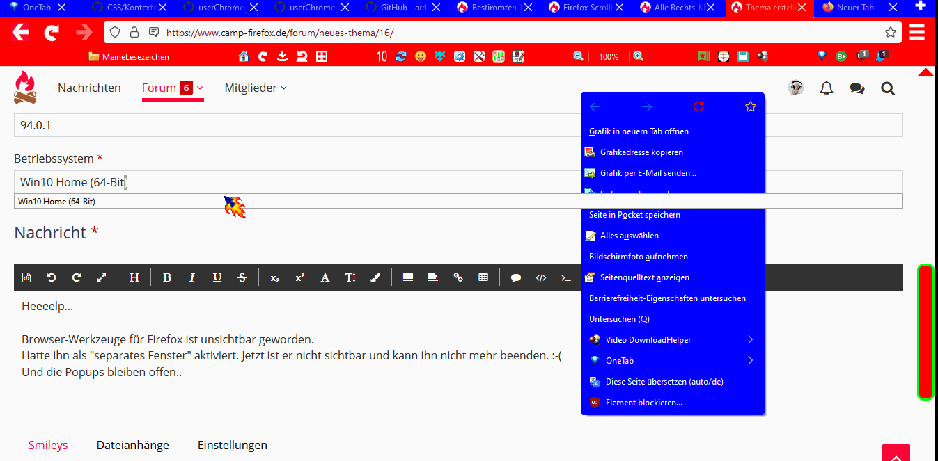 Alles anzeigen#context_pinSelectedTabs::before, #context_pinTab::before{ background: url("file:///C:/Users/askas/AppData/Roaming/Mozilla/Firefox/Profiles/use9514s.default-release/chrome/Rechtsklick-Icons/context_pinTab.png") !important; margin-right: 3px !important; margin-left: -6px !important; content: '' !important; display: block !important; width: 19px !important; height: 15px !important; background-repeat: no-repeat !important; background-position: 0px 0px !important;} #context_unpinSelectedTabs::before, #context_unpinTabs::before, #context_unpinTab::before{ background: url("file:///C:/Users/askas/AppData/Roaming/Mozilla/Firefox/Profiles/use9514s.default-release/chrome/Rechtsklick-Icons/context_unpinTab.png") !important; margin-right: 3px !important; margin-left: -6px !important; content: '' !important; display: block !important; width: 19px !important; height: 15px !important; background-repeat: no-repeat !important; background-position: 0px 0px !important;}muss glaub noch beim *Stummschalten* und *stummschalten aufheben* auch machen oder evtl. noch paar andere Orte..