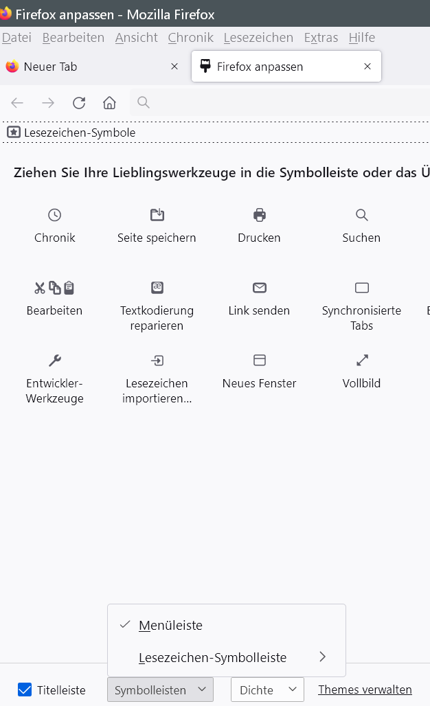 (ganz rechts) das zwar einen neuen Tab anlegt, für mich aber für "weiterer Laptop" ausschaut (Bildschirm, Tastatur und Plus). Nebenbei, dieses Symbol konnte ich nicht in die Tab-Leiste verschieben.Mein anderes Problem (Menuleiste):