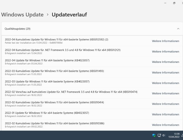 Hatte heute Abend nochmals das Update 4/2022 geladen und wollte es installieren, es kommt dann diese Fehlermeldung (richtig ist, dass sich dieses Update (Kb2022-04 kumulatives Update für Windows 11 für x64-basierte Systeme (KB5012592) nicht installieren lässt, was allerdings nicht im Gegenzug heißt, dass das System nicht mehr korrekt funktioniert, da sollte man schon einen Unterschied machen. Das will ich auch hier nicht diskutieren oder breittreten, ich warte ab, was es an Tweaks demnächst gibt, dann sehe ich weiter. Seit Installation kann ich Windows 11 vollumfänglich nutzen, ohne Einschränkung, dieses eine Update ausgenommen.