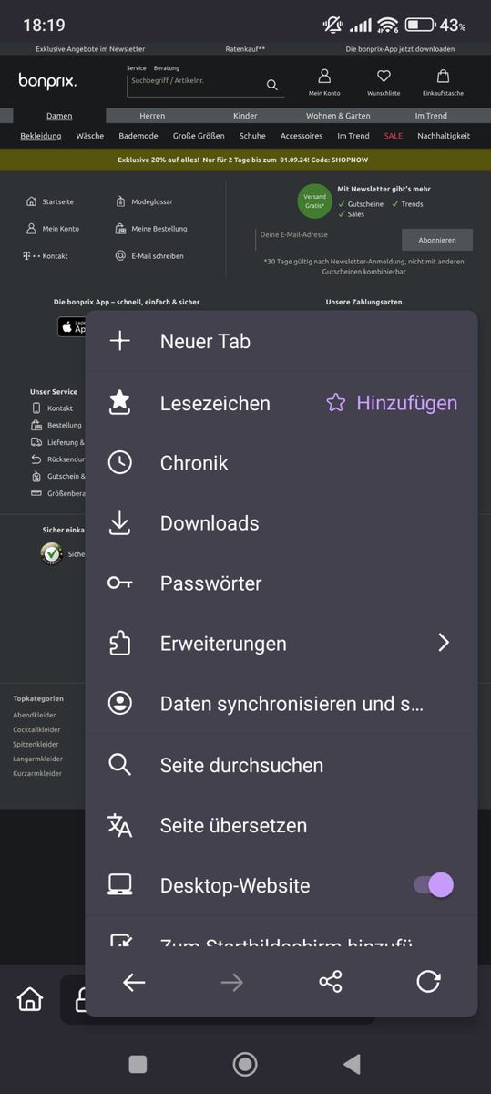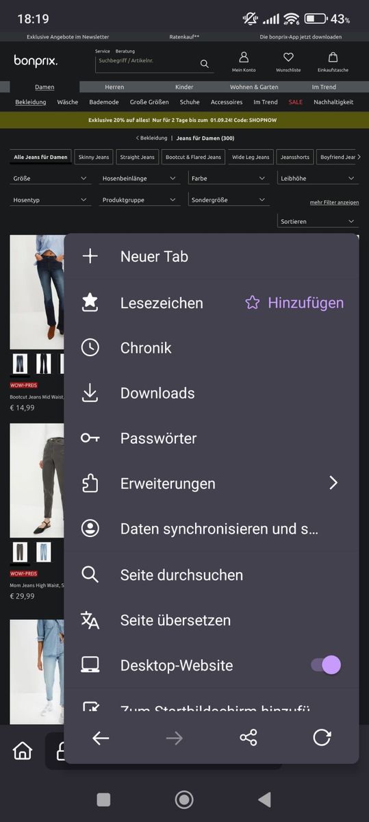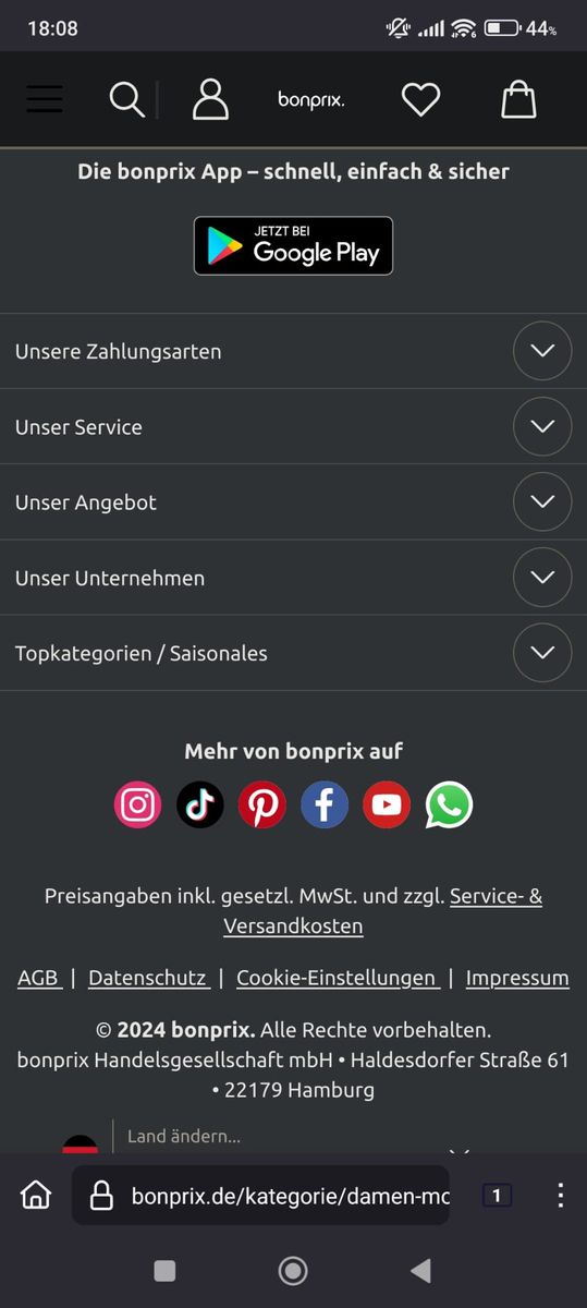 ich benötige und hoffe auf eure Hilfe, ich habe ein Problem mit dem Bonprix Onlineshop. Jedes Mal wenn ich den Shop aufrufe, werden mir die Produkte erst ganz normal angezeigt und sobald ich dann nach unten scrolle um mir die restlichen, in diesem Falle Jeans, anzuschauen, verschwindet alles und es wird mir dann nur noch der unterste Bereich der Seite mit den Zahlungsarten usw. angezeigt, aber alle Produkte sind weg. Habe es schon im Desktop Modus versucht, aber auch da geschieht beim runter scrollen das Gleiche. Ich habe auch schon meine Erweiterungen ausgeschaltet, weil ich dachte vielleicht liegt es am "Dark Reader", am "I don't care about cookies" und/oder am "uBlock Origin". Nicht hat geholfen, die Produkte verschwinden jedes Mal beim runter scrollen, hoffe man kann das auf meinen Screenshot erkennen.
