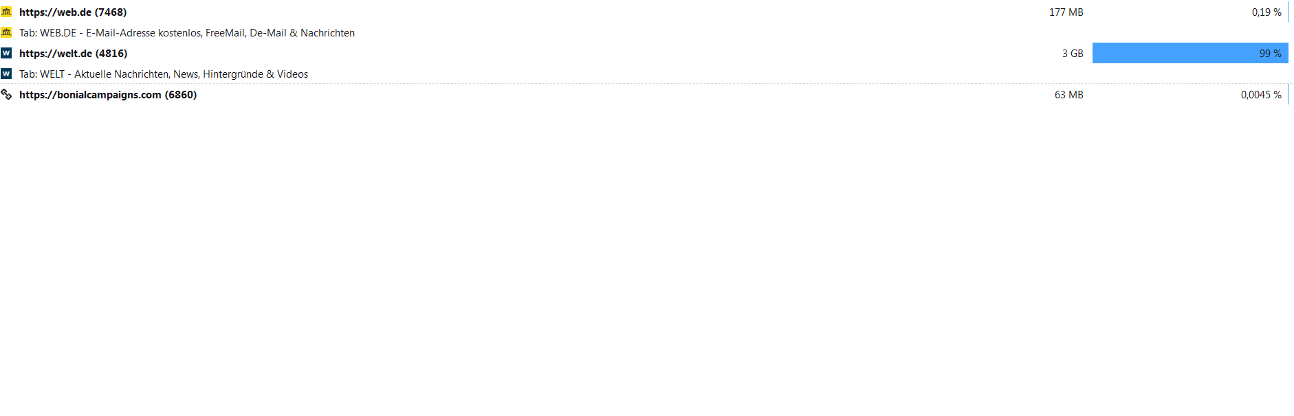 Ich vermute einen Fehler auf der Seite von Welt.de. Neben dem permanenten Hochlaufen der geblockten Inhalte durch uBlock Origin ist es auch der "Aktualisieren"-Button welcher ständig zwischen beiden Zuständen hin- und her wechselt. Da sie dort vor Kurzem noch einen Newsticker welcher sich ständig aktualisiert installiert haben komme ich immer mehr zum Schluss den Fehler dort zu vermuten. Zumal es anscheinend keine Klagen über volllaufenden Speicher gibt außer meinen Thread