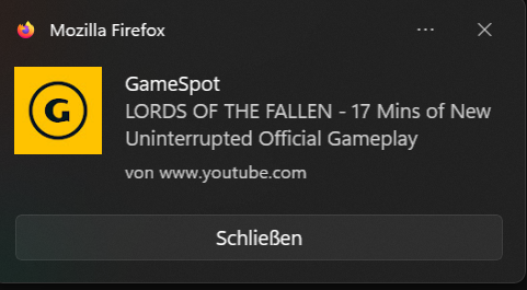 Folgendes: Seit heute, besser gesagt, seit dem Update auf Firefox 117 verschwinden die Firefox Benachrichtigungen von den verschiedenen Websites nicht mehr von selbst. Vorher war es so, dass die ein paar Sekunden eingeblendet wurden und danach wieder weggingen. Jetzt muss ich die Nachrichten immer manuell schließen. Dazu kommt noch, dass wenn ich auf "schließen" klicke, sich die Nachricht nicht nur schließt, sondern ich auch auf die entsprechende Seite verlinkt werde, was ja gar nicht gewünscht ist. Ich hab mal einen Screenshot von einem Beispiel solch einer Benachrichrichtigung angehängt, die ich meine. In dem Falle würde ich dann eben beispeilsweise auf das entsprechende Youtube Video verlinkt werden, wenn ich auf schließen gehe.