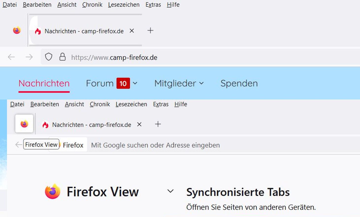Anbei ein Screenshot von den Tabs. Einmal Firefox View und einmal Normal, in einem Bild.