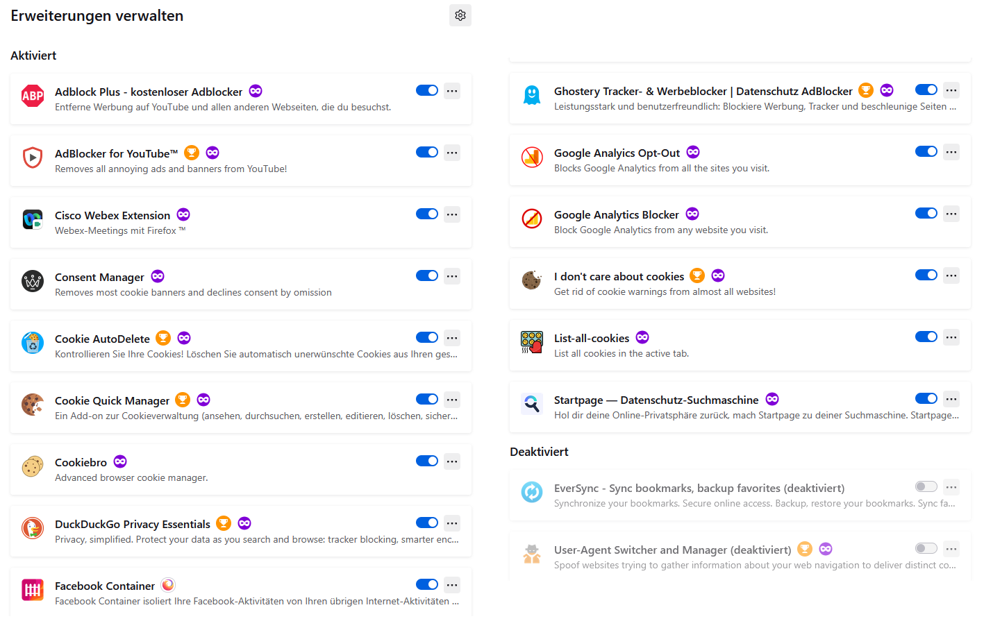 p.s. beim Fehlerbeseitigungsmodus sind alle AddOns verschwunden. Wobei ich die AddOns seit zwei Jahren im Einsatz habe und nie Probleme hatte. Ich habe die einzelnen AddOn's auch mal ausgeschaltet, aber das hat keine Änderung gebracht. Schwerpunktmäßig hat sich das seit den letzten beiden Updates geändert. Der MS-Edge hat die gleichen AddOn's, reagiert aber viel schneller.