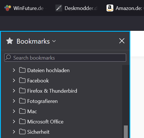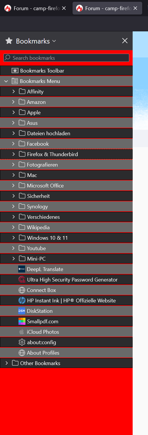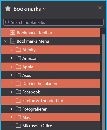 ich habe die Suche bemüht, bin aber nicht fündig geworden. Ich hätte beim meinem FF gerne ein paar Anpassungen und werde ein paar Nachrichten erstellen. Fangen wir mal an. Ist es im aktuellen FF möglich in der hier dauerhaft geöffneten Bookmarks Sidebar (auf der linken Seite) ein Zebra zu erstellen wie ich es vom Thunderbird gewohnt bin? Ich häng da mal einen Screenshot zum besseren Verständnis an.