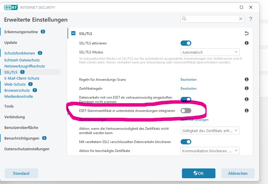 Es liegt an der Sicherheitssoftware ESET Internet Security. In den Einstellungen gibt es bei SSL/TLS die Option "ESET-Stammzertifikat in unterstützte Anwendungen integrieren". Wenn das aktiviert ist, ist die Option in Firefox gesperrt. Und wenn deaktiviert, dann wird die Option in Firefox freigegeben.