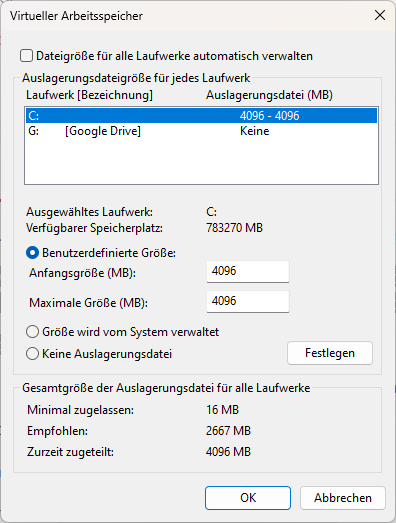 Das mit der Auslagerungsdatei überlässt du jetzt Windows, keine feste Größe mehr?