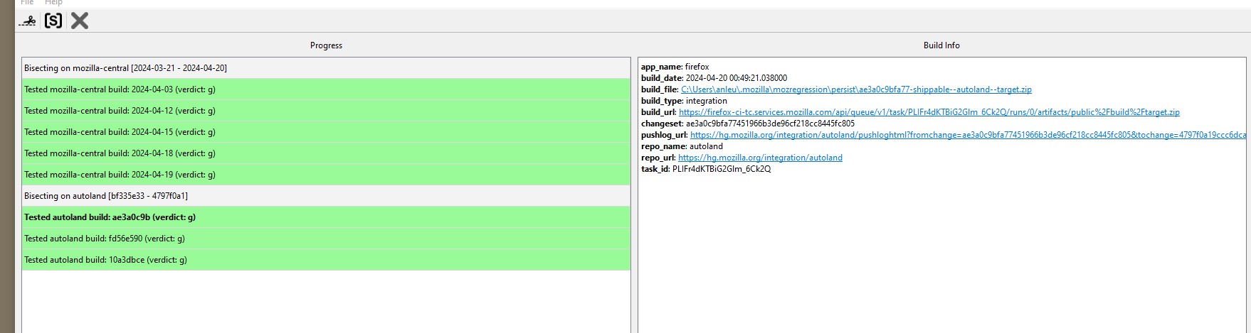 Habe dann mozregression GUI installiert und einen Test laufen lassen, leider ohne Ergebnis. Werde morgen nochmal einen Versuch starten.