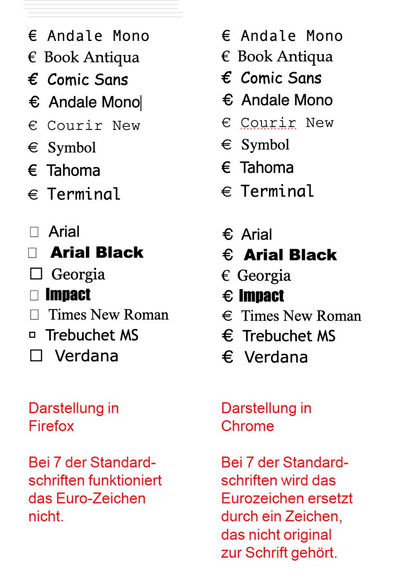 Hier der Vergleich. Bei einigen der Standardschriften ist das originale, zur Schrift passende Erurozeichen vorhanden. Bei anderen ist es nicht (mehr) vorhanden. Mein Firefox zeigt dann ein Kästchen, während Chrome ein anderes Eurozeichen aus einer fremden Schrift einsetzt.