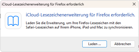 Ich verwende auf meinem Windows 11-PC den jeweils aktuellsten Firefox-Browser. Um die Lesezeichen mit meinem Apple-Account abzugleichen, habe ich "iCloud" (derzeit 7.21.0.23) installiert und mich mit meinem Apple-Account angemeldet. Wenn ich nun unter Lesezeichen > Optionen die drei möglichen Browser aktiviere, erhalte ich die Meldung: "iCloud-Lesezeichenerweiterung für Firefox erforderlich" (Screenshot)