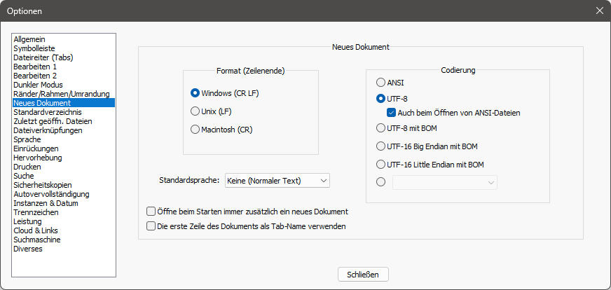 Geh mal oben im Menü Einstellungen auf Optionen. Dort dann auf den Punkt Neues Dokument. Da kannst du rechts die Codierung einstellen auf UTF-8. Danach sollte sich nichts mehr verstellen...