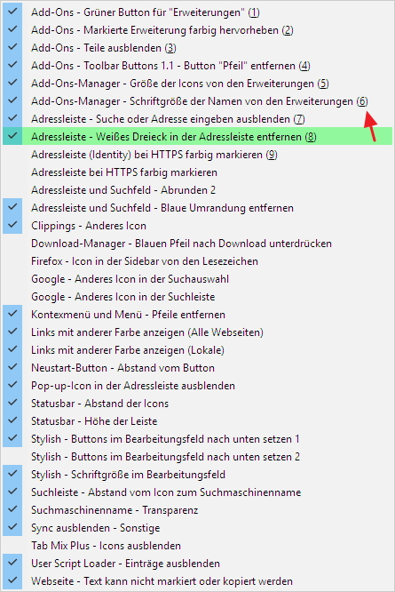 Aber in dieser Reihenfolge werden einige Add-ons ausgelassen, die aber unter 1 - 9 enthalten sein müssten, weil sie vorher unter about:addons aufgelistet sind.Kein Problem, bei mir ist es auch nur die Optik. :wink: