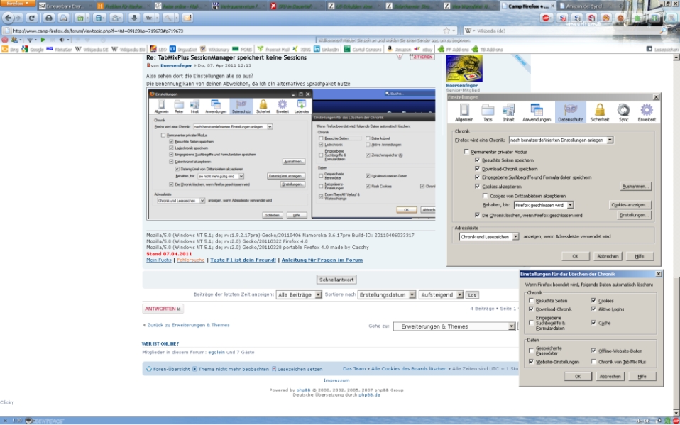 seitdem ich auf Firefox 4.0 umgestiegen bin, speichert der Session-Manager von TabMixPlus keine Sessions mehr. Manuell geht es, aber die automatische Speicherung funktioniert nicht. Die letzte und vorletzte Sitzung sind immer leer.