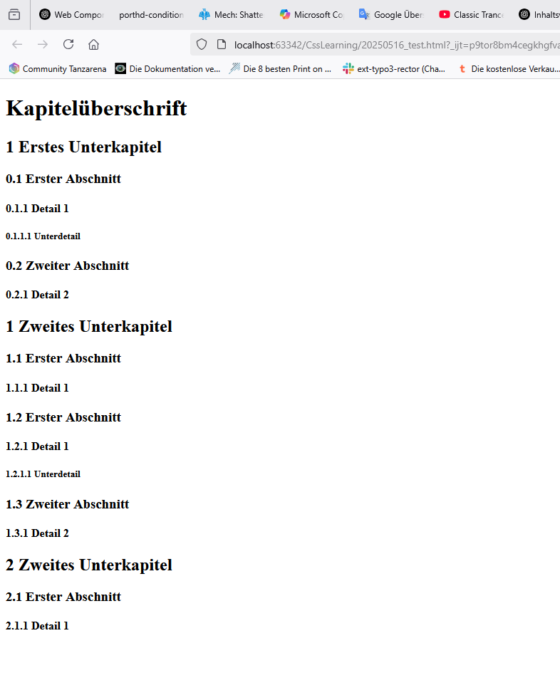 Danke für den Hinweis auf die Erläuterungen bei MDN. Leider habe ich dadurch auch nicht verstanden, warum ind divh1-h1.png und dih1-divh1.png plötzlich im h3 ein Counter auf 0 zurückgesetzt wird, der im vorhergehenden h2 noch mit 1 angezeigt wurde. Habe ich hier etwas flasch verstanden?
