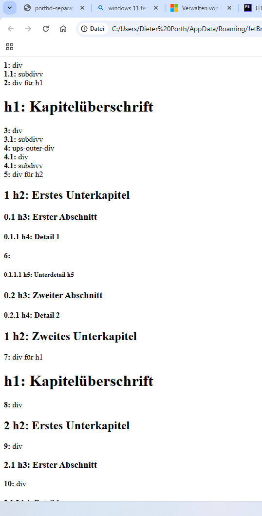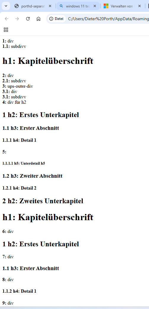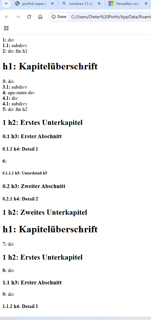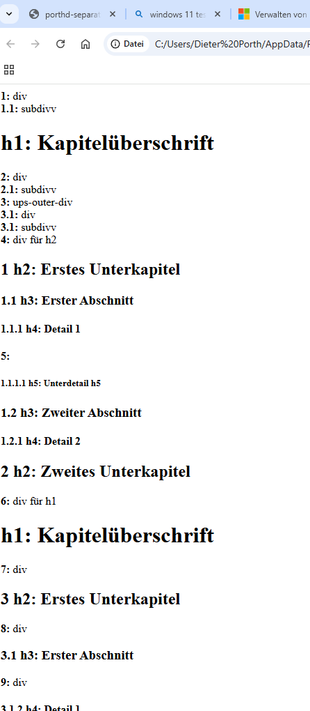 Für den Definitionsfehler bei allen Browsern scheint es notwendig zu sein, dass sowohl das erste h1-Tag wie auch das erste h2-Tag inkludiert sind (hier in ein div). Kann mir jemand einmal erklären, warum der Fehler nicht auftritt, wenn das erste h1 nicht in ein div inkludiert ist. (siehe h1-divh1.png und h1-h1.png)