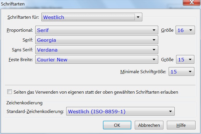 Seit Installation des neuen BS habe ich Darstellungsprobleme normaler Webseiten. Möglicherweise habe ich nicht die richtigen Schriftarten eingestellt. Wäre nett, wenn mir einige "normale" FF-User ihre Einstellungen zeigen würden.