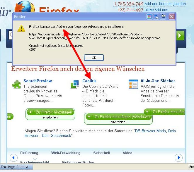 Ich konnte Cooliris mit diesem Hinweis nicht installieren. Wo ist der Fehler?