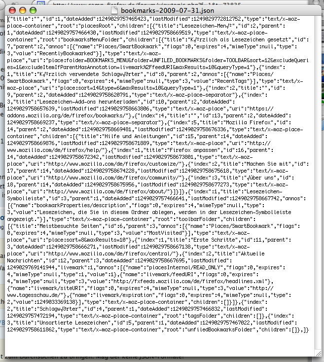 Ich musste allerdings erstmal suche, wo FF diese Datei hinsichert: klar, in profiles, musste aber nicht so sein. spotlight hat sie sofort gefunden: mithilfe der Suche nach einem ausgefallenen Wort einer meiner Lesezeichen zeigte spotlight mir, wo die ich die Datei zu suchen habe.