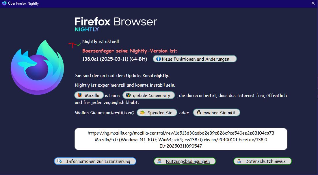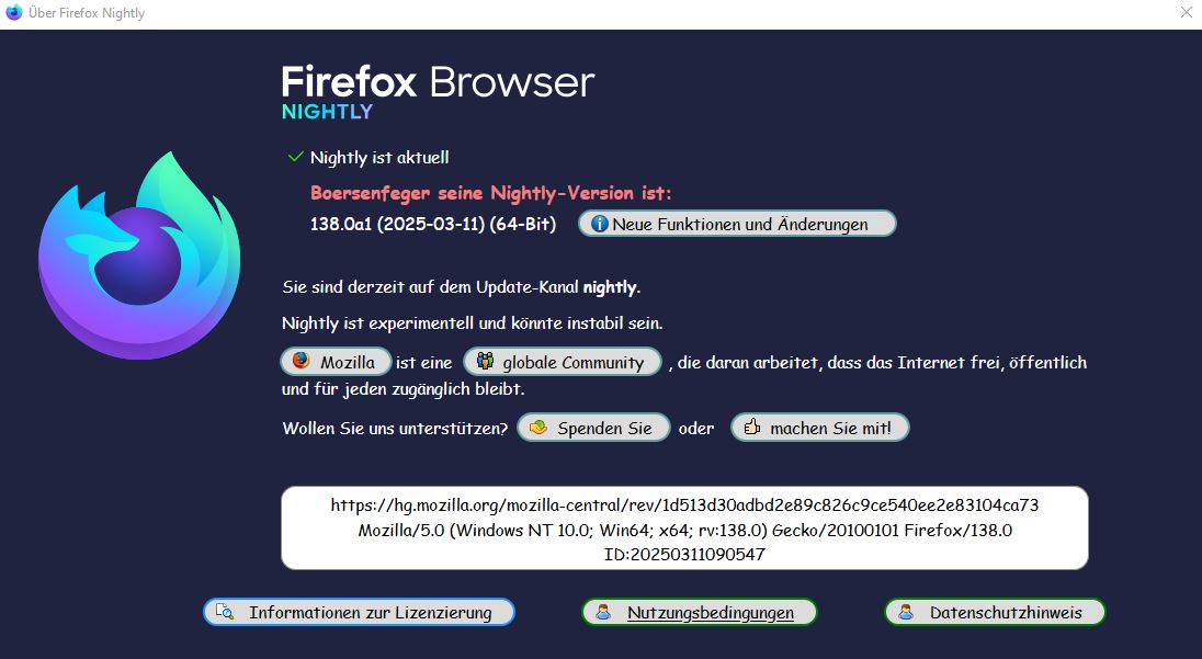 Alles anzeigen/* About : Dialog */ @-moz-document url-prefix("chrome://browser/content/aboutDialog.xhtml") { #aboutDialog, #aboutDialogContainer, #agent .textbox-input-box, #agent, #bottomBox, #clientBox, #leftBox, #trademark, #updateBox > vbox:nth-child(2) > hbox:nth-child(2), #updateButton, #version, #version::before { font-family: 'Comic Sans MS' !important; } #aboutDialog vbox, #aboutDialogContainer hbox, #clientBox vbox, #contributeDesc > label:nth-child(1), #contributeDesc > label:nth-child(2), #releasenotes, #trademark, #updateButton, label.bottom-link:nth-child(3), [href='about:credits'], [href='about:license'], [href='about:rights'], [href='https://www.mozilla.org/?utm_source=firefox-browser&utm_medium=firefox-desktop&utm_campaign=about-dialog'] { font-size: 15px !important; } #contributeDesc > label:nth-child(1), #contributeDesc > label:nth-child(2), #releasenotes, label.bottom-link:nth-child(3), [href='about:credits'], [href='about:license'], [href='about:rights'], [href='https://www.mozilla.org/?utm_source=firefox-browser&utm_medium=firefox-desktop&utm_campaign=about-dialog'] { text-decoration: none !important; } #aboutDialog, #aboutDialogContainer, #bottomBox, #clientBox, #trademark { background-color: #202340 !important; } #updateDeck::before { content: 'Boersenfeger seine Nightly-Version ist:'; font-size: 17px !important; font-weight: bold !important; color: #f08080 !important; margin-right: 6px !important; margin-left: 0px !important; } #version { font-size: 16px !important; margin-top: 30px !important; color: #fff !important; } #aboutDialog { max-height: 600px !important; min-width: 1100px !important; } #agent { appearance: none !important; margin: 50px 40px 84px -1px !important; max-height: 50px !important; padding: 5px 10px 0 10px !important; text-align: center !important; border-radius: 14px !important; max-width: 1300px !important; } #clientBox { margin-left: -50px !important; margin-right: 50px !important; } #agent .textbox-input-box { margin-top: 12px !important; margin-left: 12px !important; } #bottomBox { margin-left: 60px !important; margin-top: -15px !important; margin-bottom: 40px !important; } #updateBox > vbox:nth-child(2) > hbox:nth-child(2) { margin-top: -25px !important; margin-bottom: 20px !important; } #trademark { margin-top: 16px !important; margin-bottom: -40px !important; } #leftBox { margin-top: 60px !important; margin-left: 80px !important; max-width: 200px !important; min-width: 200px !important; } /* Build ID about Dialog css, Text mittig.*/ #rightBox textarea { background-color: white !important; color: black !important; text-align: center !important; margin-top: 30px !important; margin-bottom: 10px !important; min-width: 715px !important; min-height: 70px !important; } #icons > .icon { margin-top: 8px !important; } #updateButton { appearance: none !important; background: gainsboro url('file:///g:/Martin/A_INSTALLATIONSDATEIEN/Downloads/Icons/index1.gif') no-repeat !important; background-color: gainsboro !important; background-position: 13px 3px !important; min-width: 360px !important; padding-left: 30px !important; border-radius: 14px !important; border: 2px solid red!important; color: black !important; } #updateButton:hover { background-color: #b2edfa !important; } #updateButton .button-box { padding-top: 0 !important; padding-bottom: 0 !important; padding-start: 3px !important; padding-end: 3px !important; } #updateBox vbox description.text-blurb label.text-link { display: none !important; } [href='about:license'] { background: gainsboro url('file:///g:/Martin/A_INSTALLATIONSDATEIEN/Downloads/Icons/index1.gif') no-repeat !important; background-position: 10px 3px !important; color: black !important; margin: 0 30px 0 70px !important; padding: 0 20px 0 40px !important; border: 2px solid dodgerblue !important; border-radius: 14px !important; } [href='about:license']:hover { background-color: #b2edfa !important; } label.bottom-link:nth-child(2), label.bottom-link:nth-child(3) { background: gainsboro url('file:///g:/Martin/A_INSTALLATIONSDATEIEN/Downloads/Icons/index4.png') no-repeat !important; background-position: 10px 3px !important; color: black !important; margin: 0 30px 0 30px!important; padding: 0 20px 0 40px !important; border: 2px solid green!important; border-radius: 14px !important; } label.bottom-link:nth-child(2):hover, label.bottom-link:nth-child(3):hover { background-color: #b2edfa !important; } [href='https://www.mozilla.org/?utm_source=firefox-browser&utm_medium=firefox-desktop&utm_campaign=about-dialog'] { background: gainsboro url('file:///g:/Martin/A_INSTALLATIONSDATEIEN/Downloads/Icons/Fuchs2.png') no-repeat !important; background-position: 10px 3px !important; color: black !important; margin: 0 -2px 0 -2px !important; padding: 0 15px 0 35px!important; border: 2px solid cadetblue !important; border-radius: 14px !important; } [href='https://www.mozilla.org/?utm_source=firefox-browser&utm_medium=firefox-desktop&utm_campaign=about-dialog']:hover { background-color: #b2edfa !important; } [href='about:credits'] { background: gainsboro url('file:///g:/Martin/A_INSTALLATIONSDATEIEN/Downloads/Icons/index8.png') no-repeat !important; background-position: 10px 3px !important; color: black !important; margin: 0 5px 0 5px !important; padding:0 15px 0 35px !important; border: 2px solid cadetblue !important; border-radius: 14px !important; } [href='about:credits']:hover { background-color: #b2edfa !important; } #contributeDesc > label:nth-child(1) { background: gainsboro url('file:///g:/Martin/A_INSTALLATIONSDATEIEN/Downloads/Icons/index10.png') no-repeat !important; background-position: 10px 3px !important; color: black !important; margin: 0 3px 0 3px !important; padding: 0 15px 0 35px !important; border: 2px solid cadetblue !important; border-radius: 14px !important; } #contributeDesc > label:nth-child(1):hover { background-color: #b2edfa !important; } #contributeDesc > label:nth-child(2) { background: gainsboro url('file:///g:/Martin/A_I