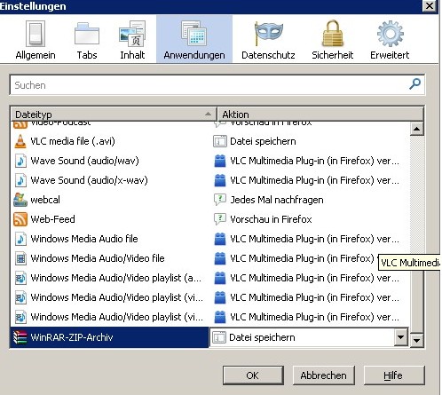 habe unter Extras-Einstellungen-Anwendungen beim Dateityp "WinRar" die Auswahl "Datei speichern" ausgewählt. Trotzdem ist bei einem Download die Option "Öffnen mit" voreingestellt. Was stimmt hier nicht?
