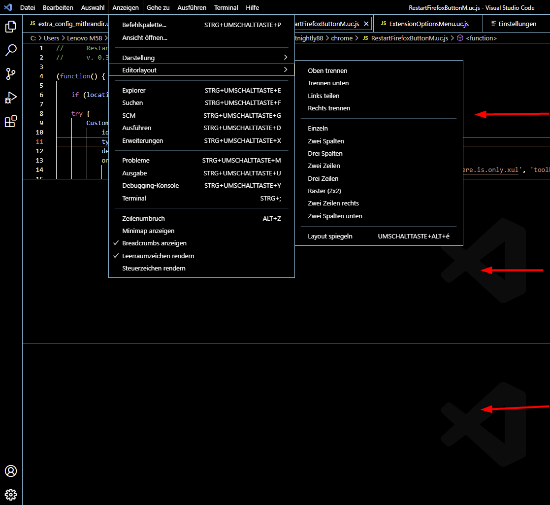 Ich denke, er meint das Editorlayout. Ich habe hier jetzt nur Visual Studio Code. Das kann das Fenster in mehrere Zeilen oder mehrere Spalten oder ein Raster unterteilen.