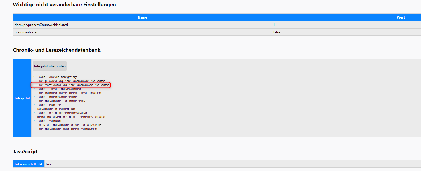VanessaF Gib mal about:support in die Adressleiste ein. Du bist jetzt auf der Seite der Informationen zur Fehlerbehebung. Gehe auf der Seite hinunter zum Abschnitt Chronik- und Lesezeichendatenbank und klicke dort auf die Schaltfläche Integrität überprüfen. Es erscheint der Anfang einer Liste von Einträgen, wo an dritter Stelle stehen müsste: „The favicons.sqlite database is sane“. Das bedeutet, dass die Datenbankdatei favicons.sqlite unversehrt, also in Ordnung ist.