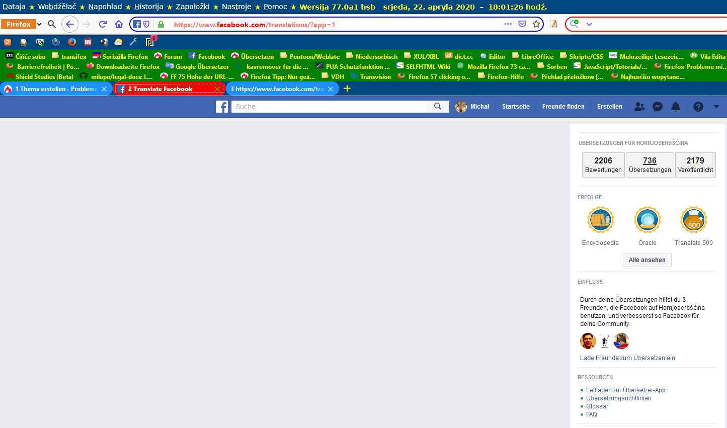 ich übersetze Facebook ins Obersorbische. Dafür stellt Facebook eine Seite zur Verfügung. Leider werden in der Desktop-Variante seit Wochen die zu übersetzenden Strings nicht angezeigt, sondern nur eine leere graue Fläche. Die mobile App würde wohl funktionieren. Das ist mir aber zu stressig. Das Problem habe ich nicht allein und wir haben uns auch schon an Facebook gewandt, warten aber schon lange auf eine Antwort. Da ich von mindestens zwei - neben mir - Übersetzern weiß, dass sie ebenfalls Firefox verwenden, wollte ich mal fragen, ob das nicht doch ein Firefox-Problem sein könnte. Ich habe da zum Beispiel die Vermutung, dass sich da ein Sicherheitsfeature von Firefox quer stellen könnte. Ich habe da z. B. auch einige Link-Tags im Quellcode der Webseite gefunden, die das Attribut crossorigin mit dem Wert anonymous haben. Könnte das eine Ursache sein?