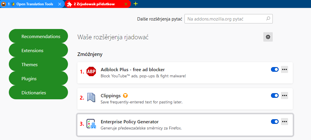 Teste mal etwas: Ersetze mal in Zeile 57 #category-discover durch #addon-category-discover und sieh mal, was sich beim Eintrag Recommendations tut.