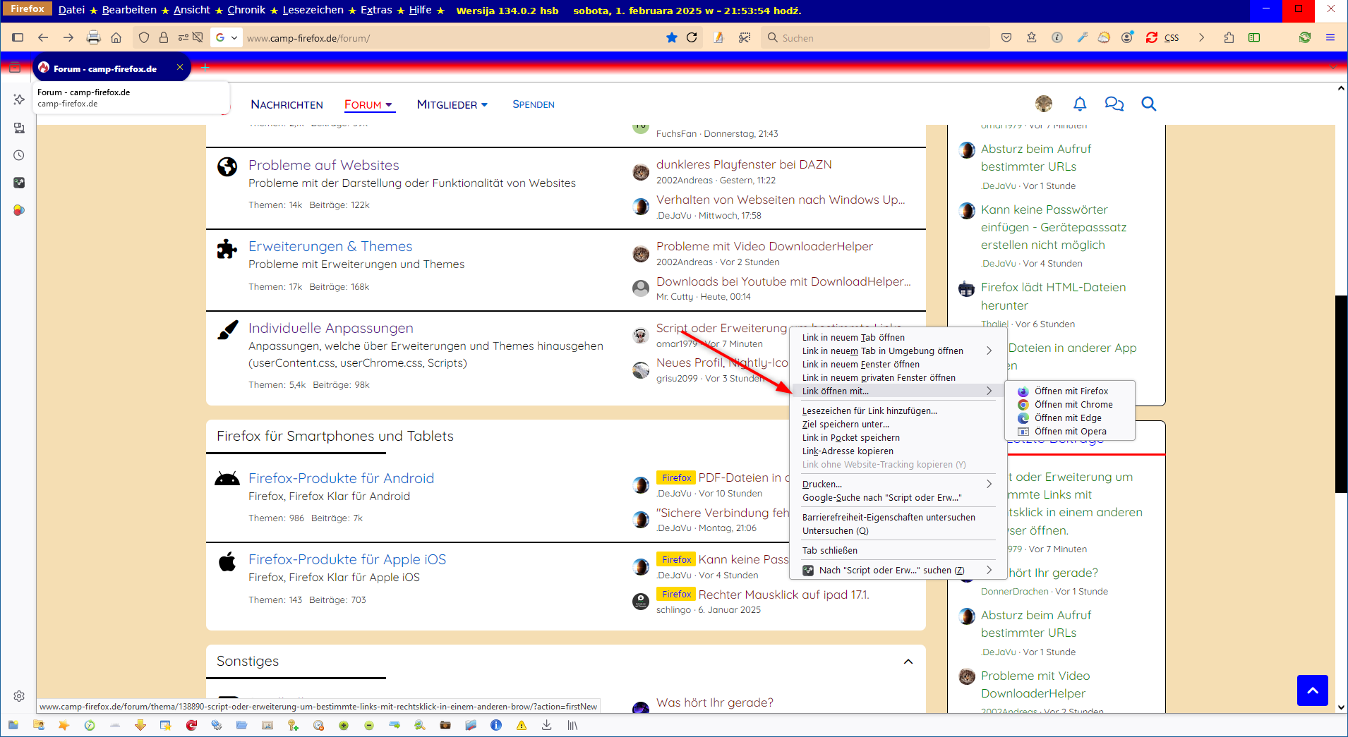 Ich habe mir die Erweiterung auch mal installiert. In deren Einstellungen muss man alles erst einrichten. Ich kenne die Erweiterung nicht, aber offensichtlich muss man erst das Paket für die Skriptsprache Python installieren und dann das verlinkte Python-Skript für die Installation von Open With herunterladen. Angeblich werden dann wohl nach der Ausführung des Installationsskripts alle bereits installierten Browser von der Erweiterung erkannt. Für eine Erstinstallation der Erweiterung erscheint mir das doch etwas kompliziert, zumal auf der SUMO-Seite nichts davon steht. Im Gegenteil, es steht da, dass die Erweiterung nicht mehr weiterentwickelt wird.
